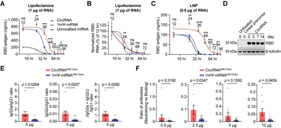 一系列的對(duì)比評(píng)估表明,與mRNA疫苗相比,circRNA疫苗具有以下特點(diǎn)或優(yōu)勢(shì)(圖3):1)circRNA具有更高的穩(wěn)定性,可以在體內(nèi)產(chǎn)生更高水平、更加持久的抗原;2)circRNA疫苗誘導(dǎo)機(jī)體產(chǎn)生的中和抗體比例更高,可以更有效地對(duì)抗病毒變異,降低疫苗潛在的抗體依賴增強(qiáng)癥(ADE)副作用;3)circRNA疫苗誘導(dǎo)產(chǎn)生的IgG2/IgG1的比例更高,表明其主要誘導(dǎo)產(chǎn)生Th1型保護(hù)性T細(xì)胞免疫反應(yīng),可以有效降低潛在的疫苗相關(guān)性呼吸道疾病(VAERD,Vaccine-associated enhanced respiratory diseases)副作用。