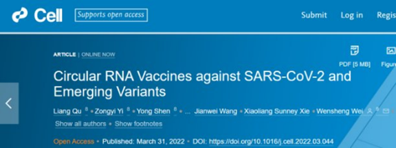1.Wensheng Wei et al. Circular RNA Vaccines against SARS-CoV-2 and Emerging Variants. Cell(2022)https://doi.org/10.1016/j.cell.2022.03.044