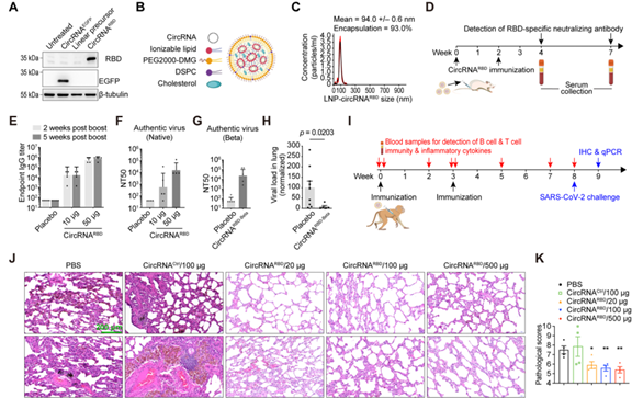 研究發(fā)現,“該環(huán)狀 RNA 疫苗可以在小鼠和恒河猴體內誘導產生高水平的新冠病毒中和抗體以及特異性 T 細胞免疫反應,并可以有效降低新冠病毒感染的恒河猴肺部的病毒載量,顯著緩解新冠病毒感染引起的肺炎癥狀?!?