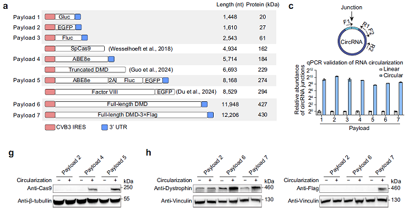 利用CIRC技術(shù),研究團隊成功環(huán)化了編碼全長肌營養(yǎng)不良蛋白(約 12,206 個核苷酸)的 RNA,并實現(xiàn)了 427 KDa 蛋白的完整表達。這一重大突破,徹底打破了環(huán)化 RNA 編碼蛋白大小的限制,為大分子量蛋白缺失相關(guān)疾病的治療開辟了全新路徑。